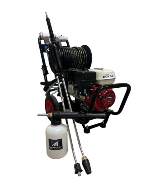 This Honda GX200 pressure washer is fitted with a reduction gearbox which enables continuous operation throughout extended cleaning sessions, generating a powerful 14lpm at 2200Psi through its 20-meter hose reel.
