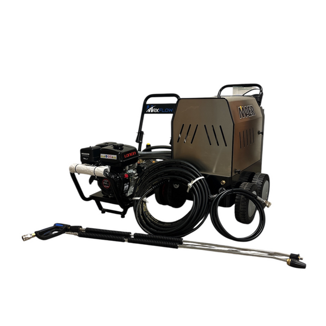 This compact yet powerful hot water cleaning system combines the Loncin G200 petrol engine with a MAER Gyster mobile diesel burner, delivering 14 litres per minute at 150 bar pressure. Ideal for professional cleaning in agriculture, equine facilities, mobile detailing, construction sites, and light industrial applications where hot water is essential for cutting through grease, grime, and biofilm.
